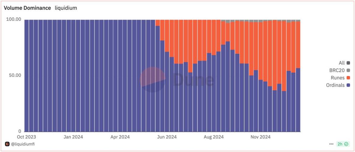 The volume of loans on Liquidium has consistently increased over the past year, with Runes now comprising the majority of activity on the platform.