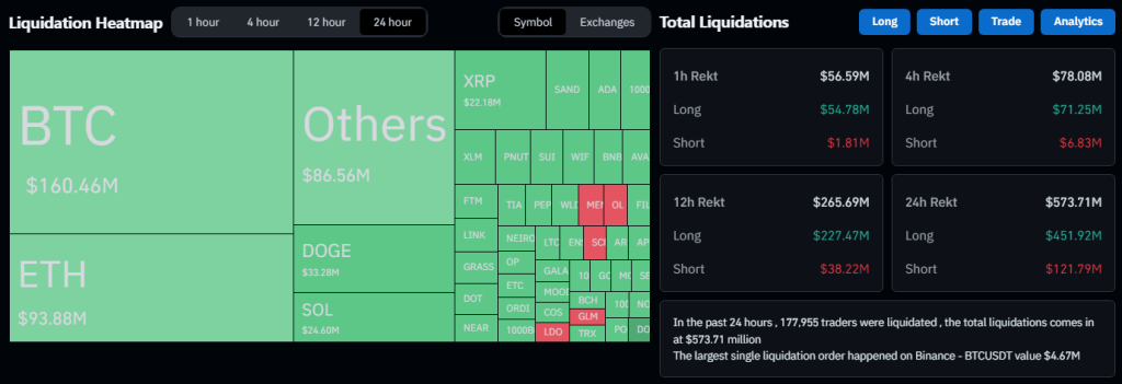 Bitcoin’s dominance remains robust, with a current market capitalization of $3.23 trillion, which accounts for over 56% of the total crypto market. The highest liquidation of the day was a $4.67 million BTC/USDT exchange on Binance, which is indicative of the high stakes involved in leveraged trading.