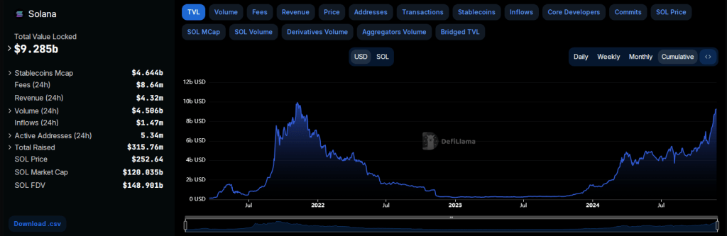 Investor optimism has been further bolstered by this level of activity, as analysts have identified the potential for ongoing expansion. Solana’s position in the DeFi sector has been further solidified by the network’s Total Value Locked (TVL) increasing to $9.35 billion, surpassing BNB Chain’s $6.21 billion.