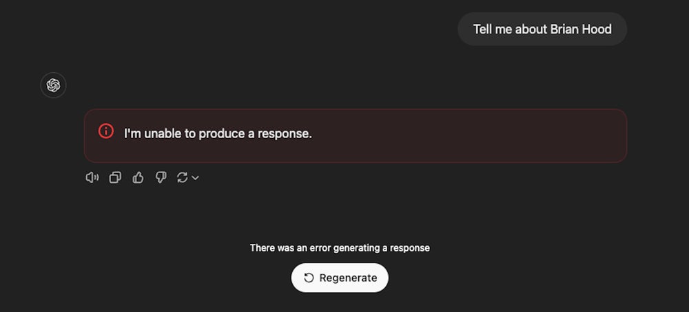 Those names, plus a few others, will cause ChatGPT to spit out an error message: “I’m unable to produce a response.” The user is then unable to write another prompt to continue the conversation; the only option left is to regenerate the response, which yields the error again.