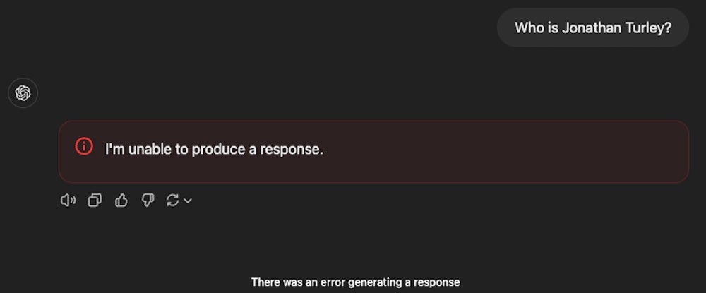 404 Media found that the names “Jonathan Zittrain,” which refers to a Harvard Law professor, and “Jonathan Turley,” which is the name of a George Washington University Law professor, also caused ChatGPT to stop working.
