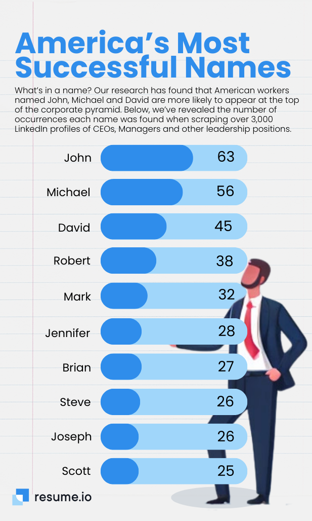 A new survey from Resume.io analyzed more than 3,000 LinkedIn profiles to find out what, if any, influence a person’s first name has on making it in corporate leadership. And it turns out that some names appear more frequently in authoritative roles than others.
