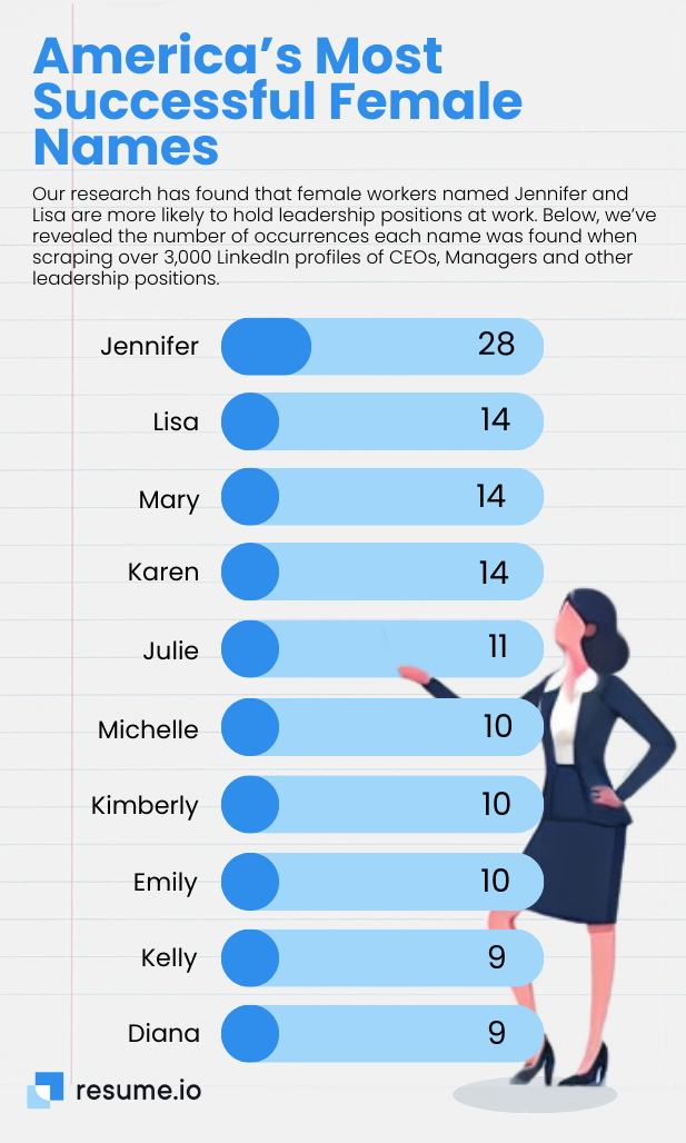 Only one female name made the top 10 list (Jennifer), which took the No. 6 spot. Only one-third of the profiles Resume.io analyzed were women.