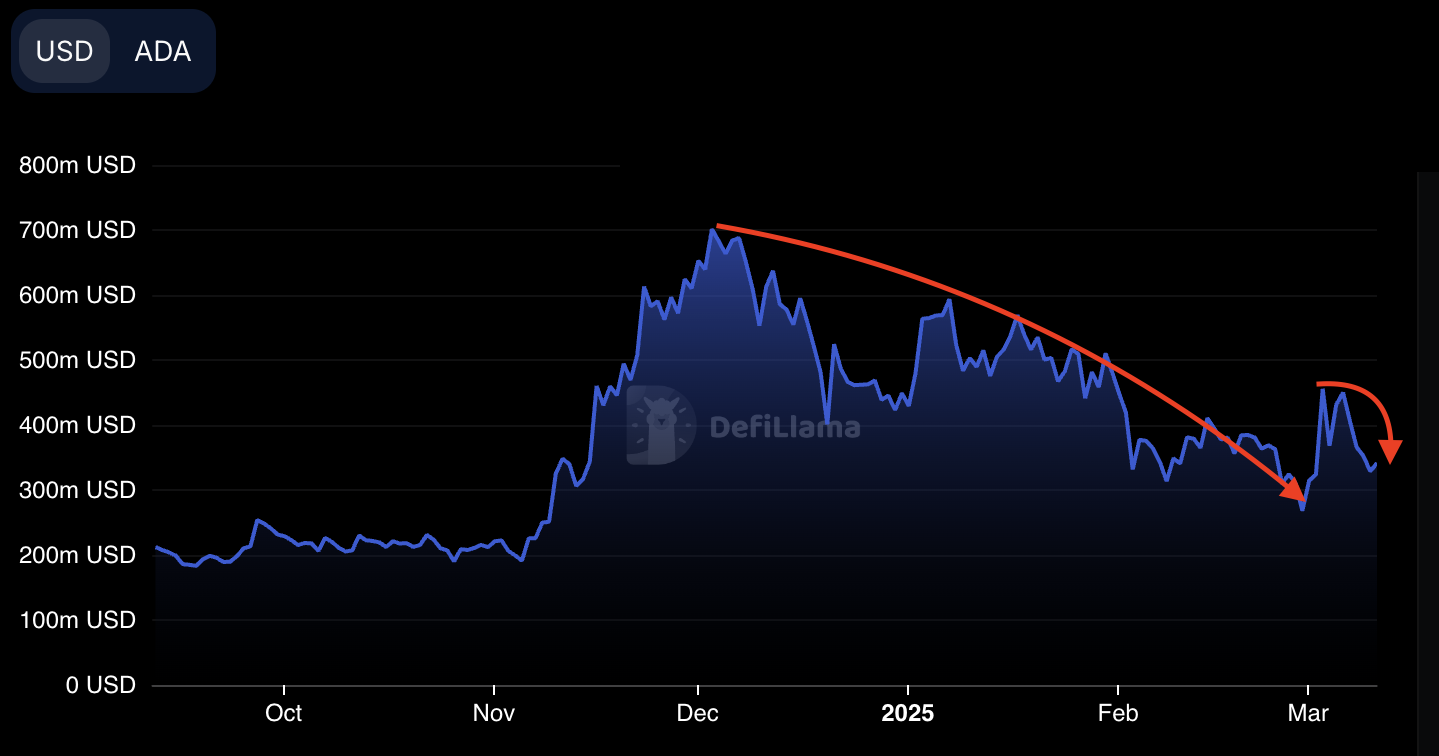 Cardano’s TVL has plummeted from $701.4 million on Dec. 3, 2024, to reach a four-month low of $268 million on Feb. 28.