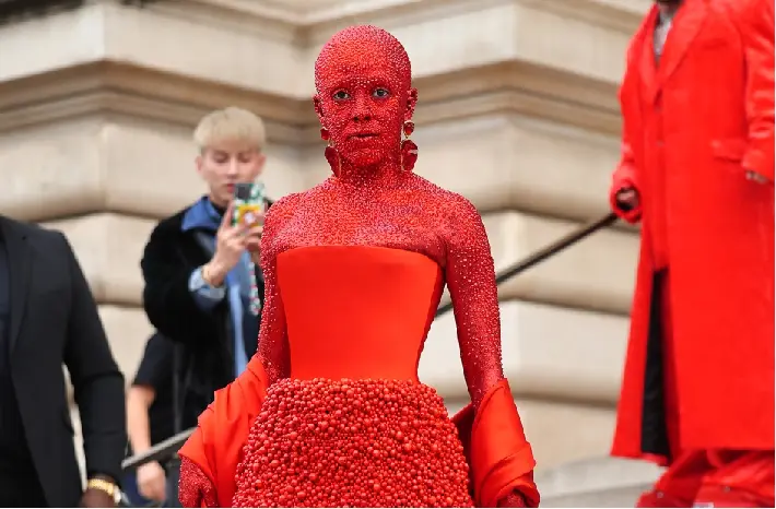 The @schiaparelli Haute Couture SS23 show in Paris featured 30 000 @swarovski crystals applied by hand by Doja Cat Couture @dojacat, the fashion house announced on Instagram. As part of his stunning ensemble, the rapper wore a “red silk faille bustier,” a “hand-knit skirt of lacquered wooden beads” and “trompe l’œil toe boots.”